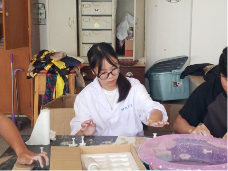 在本次活动中,首先由实验室老师讲解基本工艺,并做示范。随后,在老师的指导下实践团成员亲手制作汝瓷,从灌浆到脱模,实践团成员记录时间,及时进行补浆,细致入微。脱模后待坯体稍干,实践团成员开始进行打磨,准备素烧。在素烧过程中,实践团成员收集了一些陶泥和制作小饰品的工具,使用陶泥制作手工艺品。