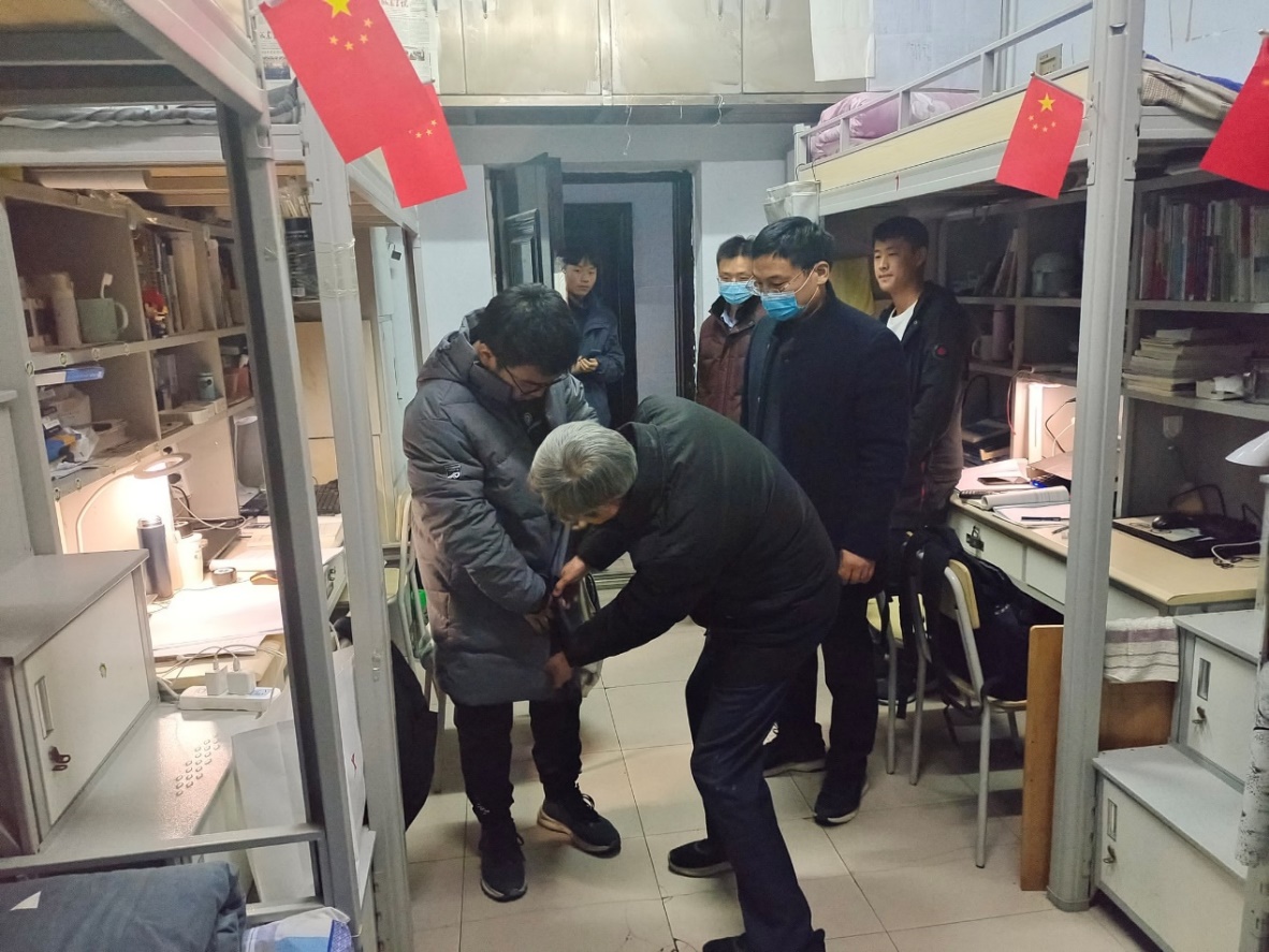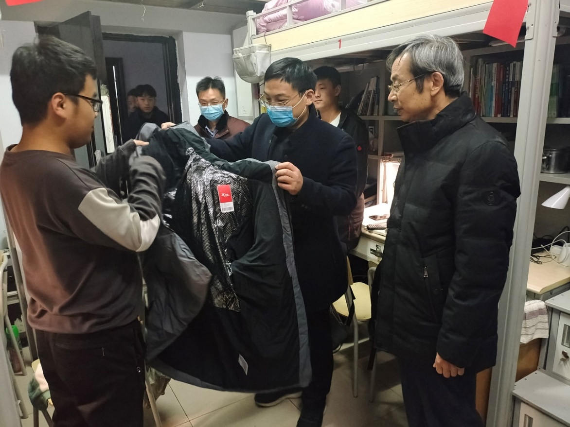 杨风岭深入学生宿舍,仔细询问同学们家庭情况,在校的学习生活情况。他表示,学校一直很关注经济困难学生的学习生活,会尽最大可能关爱和帮助同学们。在发放棉服的同时,他勉励同学们要树立远大理想,刻苦学习,励志成才,练就过硬本领,用实际行动回报家庭、社会和母校。受资助的同学纷纷表示一定不辜负校领导的嘱托和期望,定会努力践行“厚德唯实,博学慎思”的校训精神,成为一个有用之人,将来回报社会、回报母校。