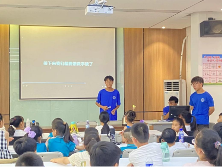 活动伊始,实践团成员向小朋友们讲述了洗手的五步法,即“湿、搓、冲、捧、擦”,同时邀请小朋友上台进行学习,以此加深小朋友们的印象。紧接着,实践团成员以视频的形式向小朋友们播放制作洗手液的过程。在视频中,详细地展现了实践团成员在实验室制备洗手液的具体环节,让小朋友们仿佛身临其境。同时,实践团成员又逐一讲解了制作洗手液所用到的药品和各种实验仪器,包括仪器的名称、用途和操作要点等等,充实了小朋友们的科学知识库。最后,实践团成员为小朋友们分发了洗手液样品,小朋友们接过样品,脸上洋溢着兴奋和期待的神情。