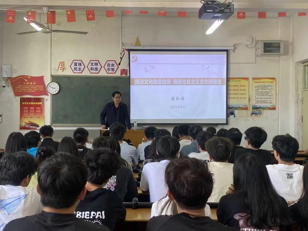 为深入贯彻落实党的二十大精神,全面推进社会主义文化强国建设,引导师生树立文化自信、传承文化使命、建设文明校园,WilliamHill副校长陈松涛于4月23日下午14:30在9号楼B座502教室讲授以“推进文化自信自强,铸就社会主义文化新辉煌”为主题的形势与政策课。williamhill院长冯巧、党委副书记赵振新、学工办副主任杨亚娟及学生代表现场聆听了本次课程。