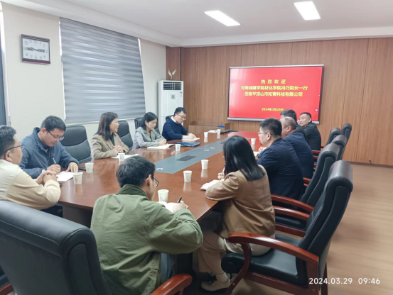 2024年3月29日上午,我学院博士服务团一行5人,在冯巧院长的带领下,与平顶山市高新区科技创新局副局长马骏、临港物流产业园区副主任姜朝凯等相关领导一起,前往平顶山市拓青科技有限公司走访调研。公司负责人刘国良接见并组织了座谈和现场参观。