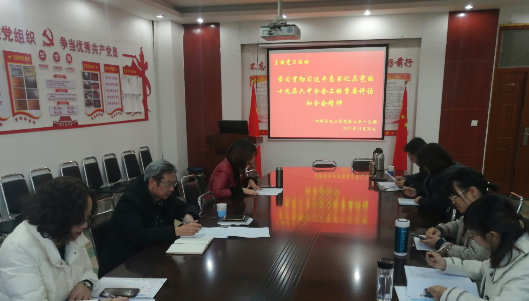 (通讯员李银峰)11月30日下午5点,材化学院教工第一党支部在材化学院会议室召开了“学习党的十九届六中全会精神”主题党日活动,会议由党支部书记胡继勇同志主持,副校长杨风岭和全体党员参加。