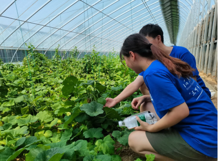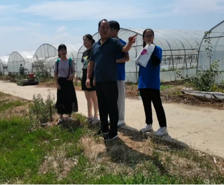 7月15日上午,实践团成员乘车到达平顶山市鲁山县磙子营镇韩庄村蔬菜大棚产业基地。韩庄村书记带领老师和团队成员参观了两种蔬菜大棚:温室大棚和日光棚。并且就有关大棚种植规模、种植有机蔬菜种类、种植技术等问题进行了交流。通过此次走访调研,队员们掌握了茄子、青菜等蔬菜的生长条件、价格等方面的基本情况,初步与大棚农户建立合作关系,将蔬菜大棚与轻饮食联系起来,将蔬菜加工以轻饮食的方式进行销售。