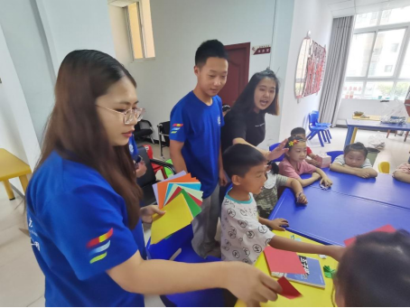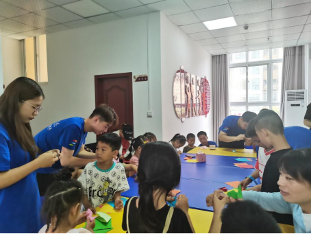志愿者们细心地教孩子们折纸