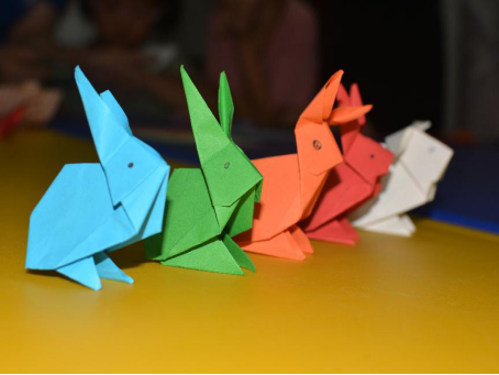 活动前,志愿者们早早地将彩纸、剪刀等工作摆放整齐,静待孩子们的到来。共有二十多位小朋友参与进来,志愿者用妙趣横生的语言向孩子们描述折纸过程,孩子们在志愿者们的帮助下,经过一次次对折、按压、裁剪、绘画等步骤,平平无奇的纸张被他们折成了一个个憨态可掬的小兔子,小朋友们兴奋地向志愿者展示自己的作品。活动现场充满了欢笑、洋溢着快乐。