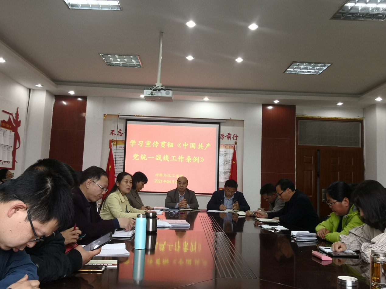 (通讯员 薛明三) 为提高统战意识,学习宣传《中国共产党统一战线工作条例》,全面准确学习领会党的统一战线方针政策,4月20日下午,材化学院党委在学院会议室召开教工大会,学习贯彻《中国共产党统一战线工作条例》。会议由材化学院党委书记焦学然主持。