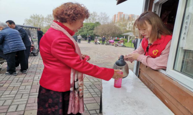 志愿者为市民倒热水