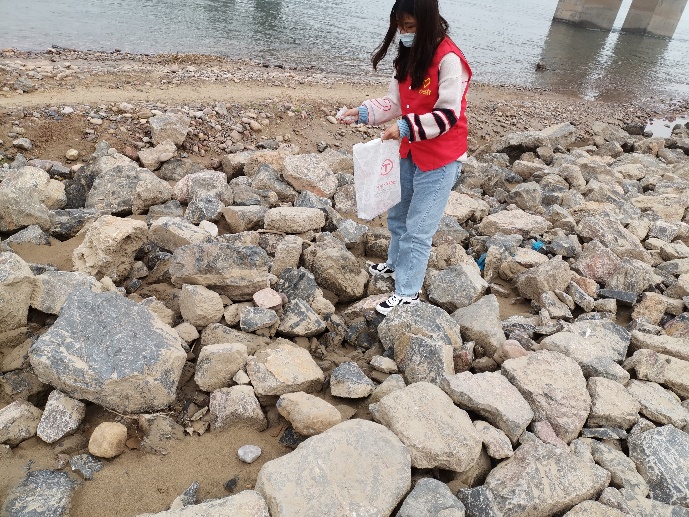 志愿者在岸边拾取垃圾