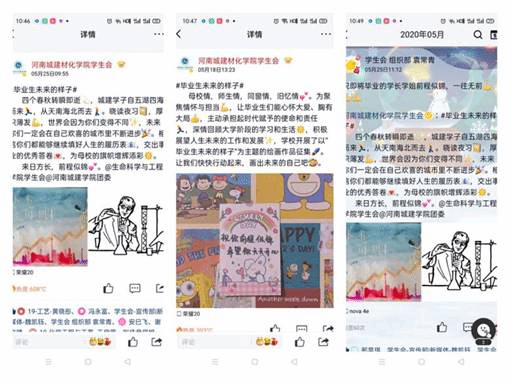 本次活动分为两个阶段。第一阶段,学院通过官方QQ、微博动态等多个网络平台进行线上宣传,并对材化学子进行图画征集。第二阶段,学院对上交的作品进行审核筛选,并对手绘图片进行了“@接龙活动”。在此期间,材化学子大力支持,积极转发官方动态并对毕业生送上了真挚的祝福。