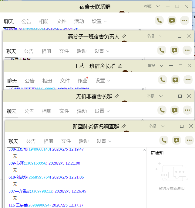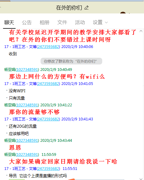williamhill本次防控工作主要从三个方面进行。第一,做好重点学生慰问工作,积极排查湖北籍以及在外打工学生,并针对18名湖北居住地学生及41名在外务工学生建立专属QQ群,协助解决学生所遇问题;第二,形成“辅导员统筹—班长协助—宿舍长落实—学生执行—家长监督”的多级联动机制,保证学校每一项重要通知切实落实到个人,同时利用QQ群作业、群接龙、群投票、群公告等形式,确保每一位同学每天及时汇报情况,接收学校的重要通知;第三,利用新媒体,加强防控知识宣传教育。在微信平台、qq动态等新媒体,广泛宣传疫情防控的相关政策和专业知识,引导师生科学认识疫情,增强自我保护意识。