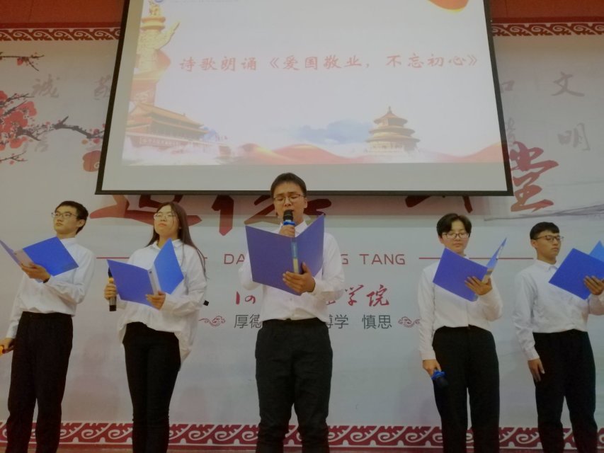 此次道德讲堂分为唱国歌、观典礼、诵经典、谈感悟、唱歌曲、送"吉祥"六个环节。活动伊始,全体起立,奏唱国歌。随后全体师生一起观看微视频《国家勋章和国家荣誉称号授予仪式》看爱国敬业人,学习敬业模范和民族团结模范先进个人的事迹;学生代表们诵读的《爱国敬业,不忘初心》,材化学子们体会到爱国需要兢兢业业、勇敢担当、不忘初心、牢记使命;学生代表袁常青分享了自己的感受,自律自强,奋发进取;随后全体师生合唱《我和我的祖国》表达对祖国的敬意和祝福;紧接着党总支书记焦学然讲话,希望各位青年大学生能够自强不息,奋斗不止,为祖国建设的宏伟蓝图画上浓墨重彩的一笔;活动最后,焦学然书记带领学院领导老师在送"吉祥"环节全体学生赠送精美卡套及配套“道德讲堂”主题卡贴,全场活动结束。