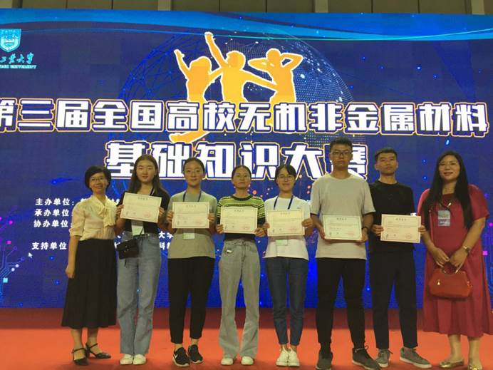 (通讯员 张小婷)2019年9月7日,由教育部材料类专业教学指导委员会主办,南京工业大学承办的第三届全国高校无机非金属材料基础知识大赛在南京工业大学举办,有来自全国66所高校的126支队伍600余人的选手参赛。本次大赛以学生为中心的教育理念为引导,以夯实基础、提升能力为目的,以赛促学,以学促教。我院建材教研室张小婷、李青霄老师带领无机非金属材料工程专业的刘熔、王园园、李东林、张思卿、姚兰、马怡彤六位同学组成两个参赛队参赛,双双取得三等奖的佳绩。